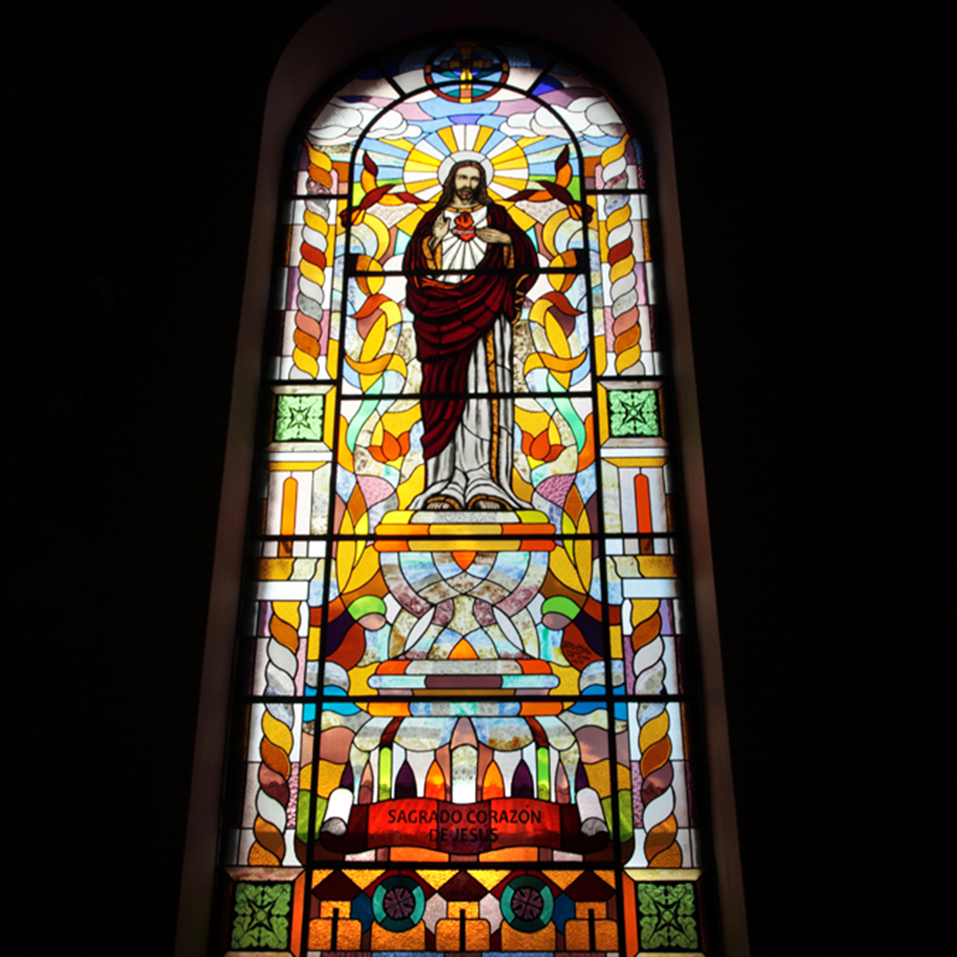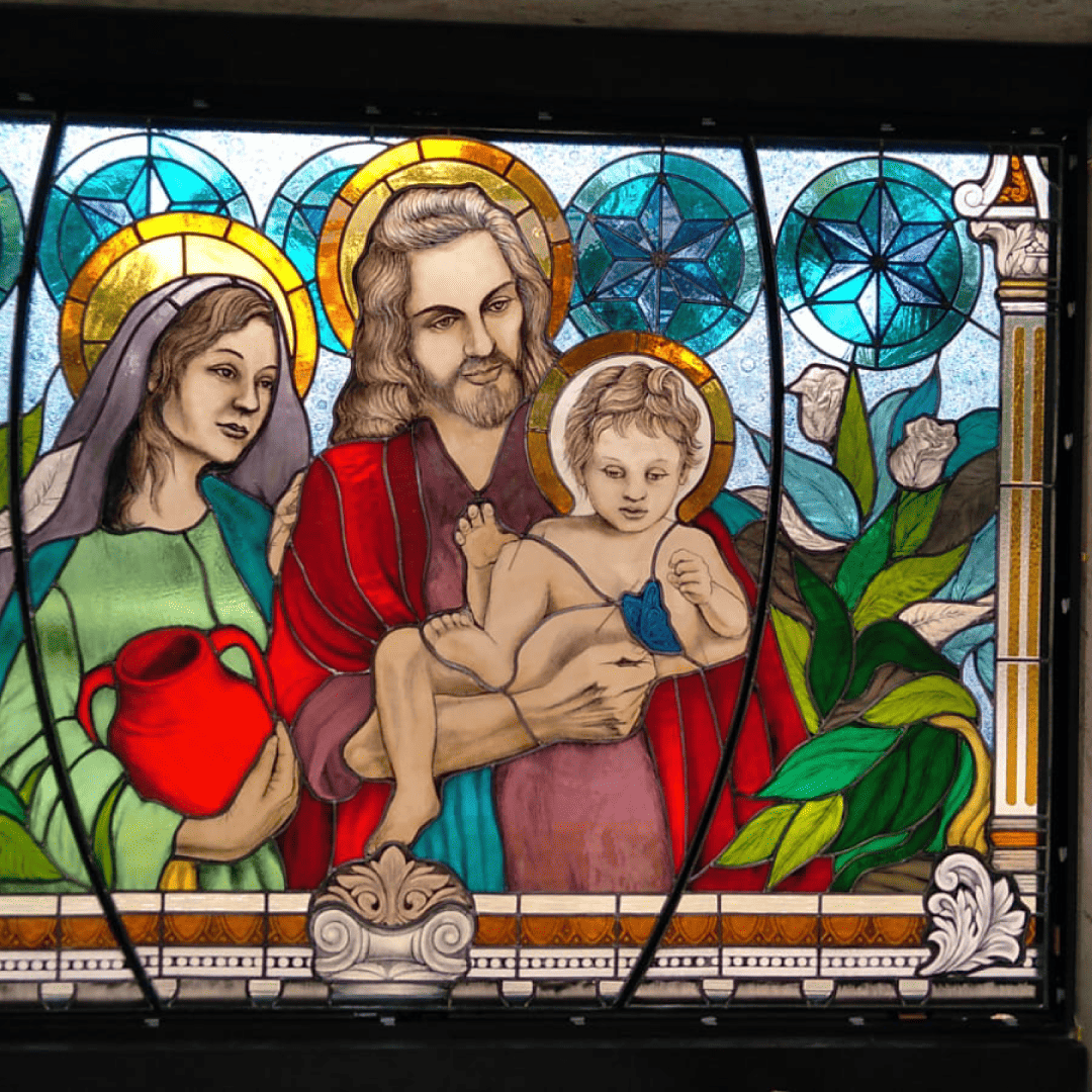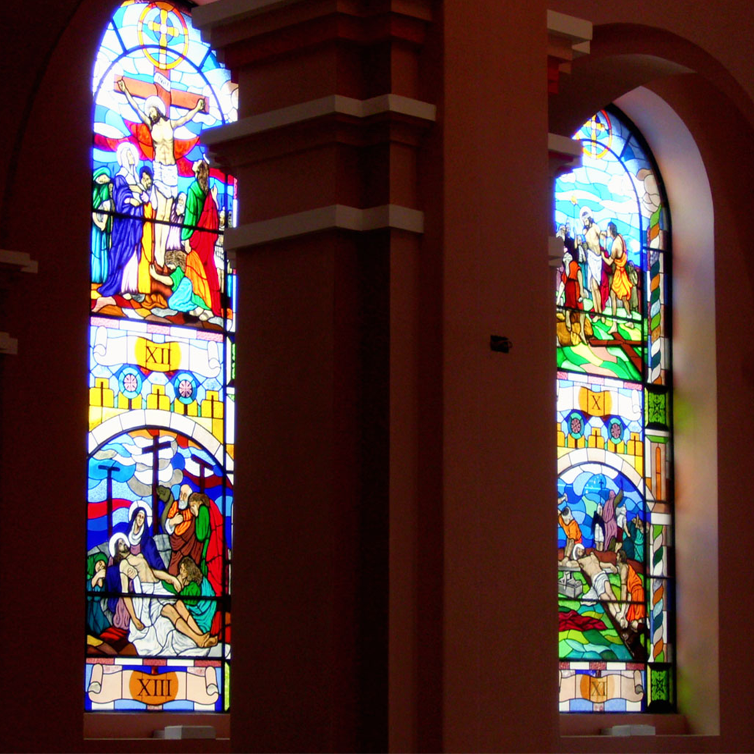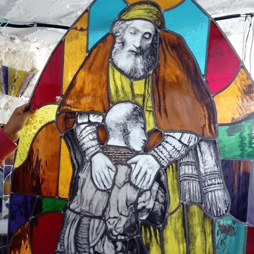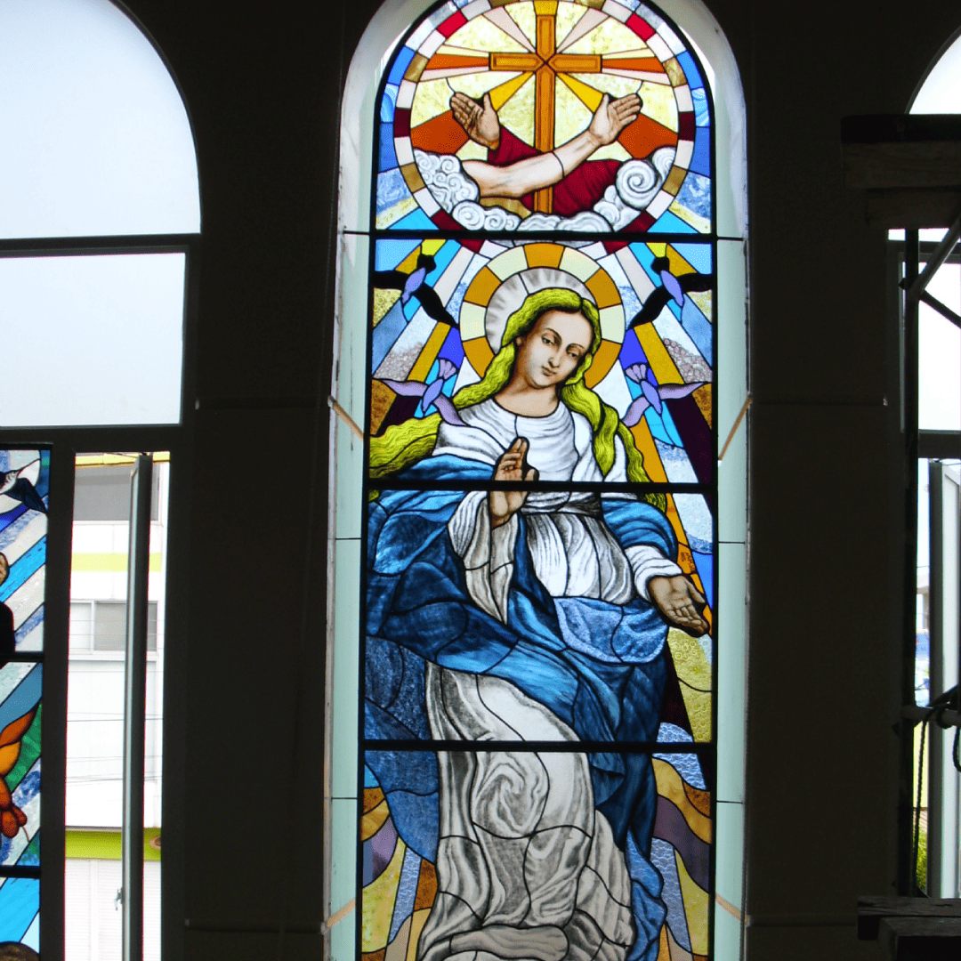 Una amplia experiencia en la elaboración de vitrales con escenas religiosas que incluyen imágenes. Este tipo de vitral se basa en la antigua técnica europea de la grisaglia al fuego, para la definición de rostros, manos y demás detalles.