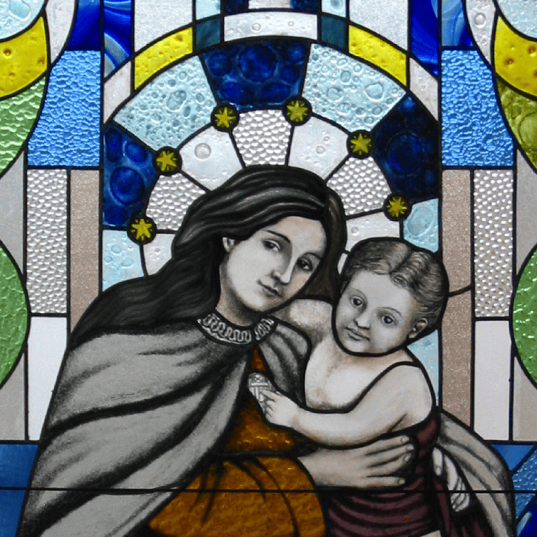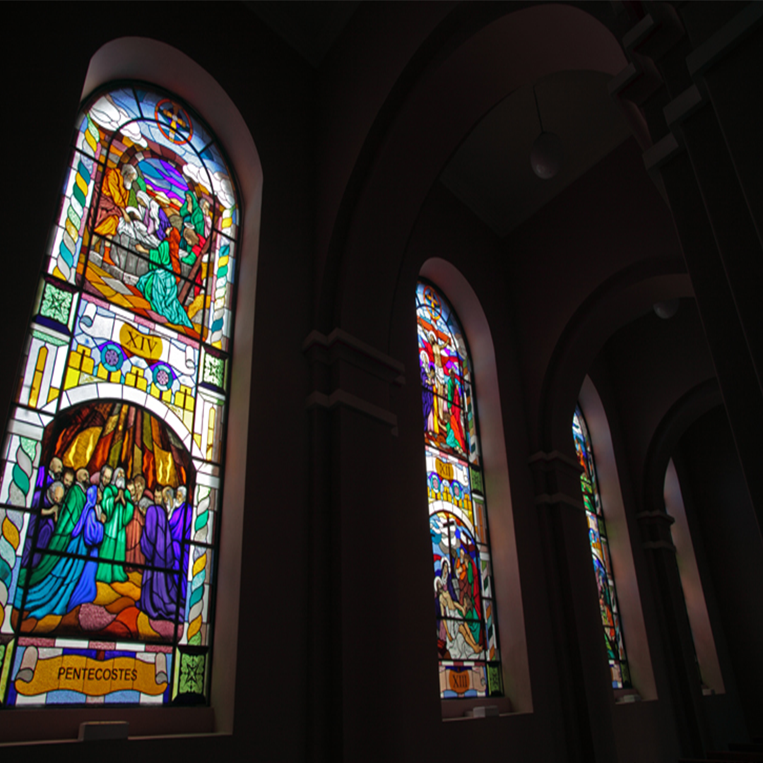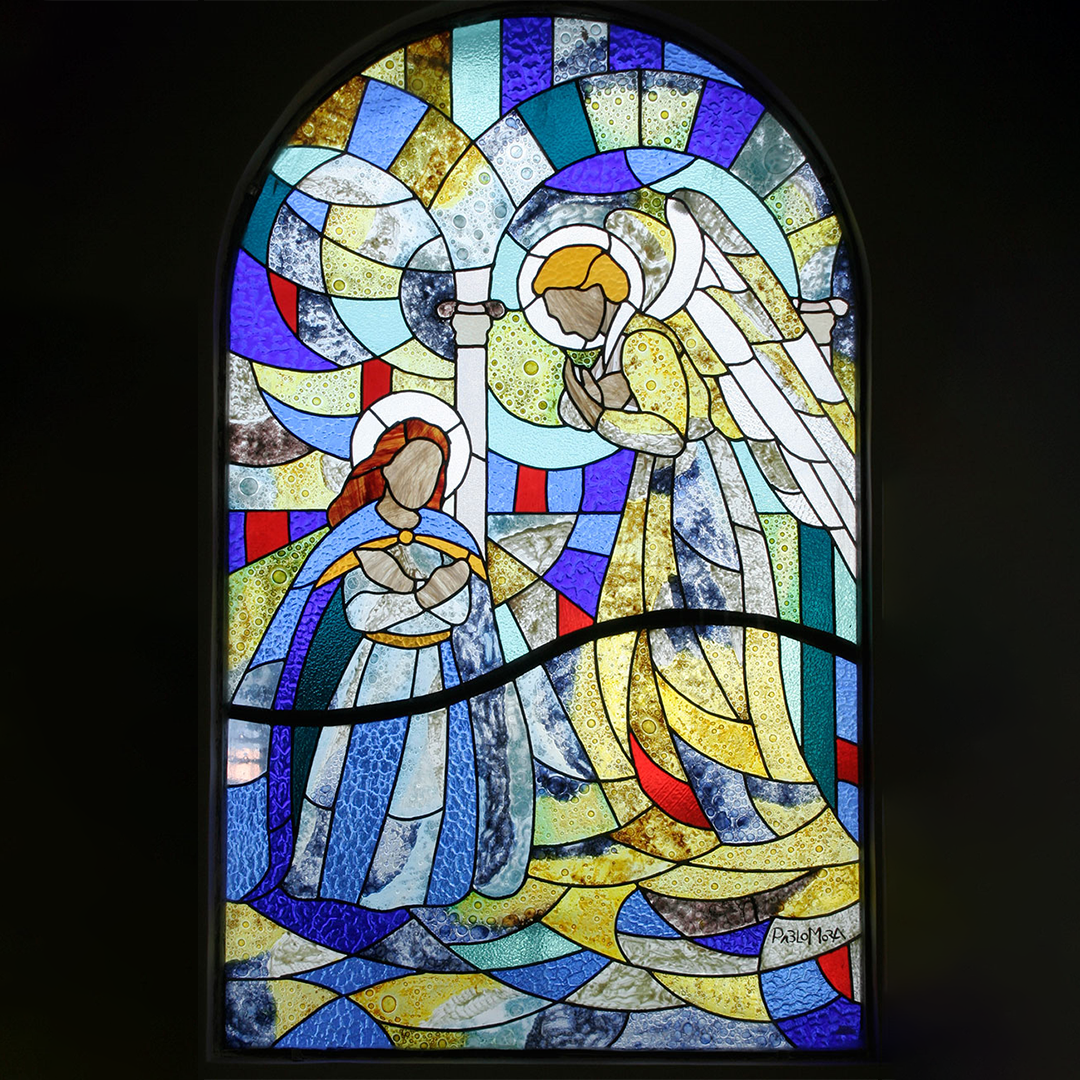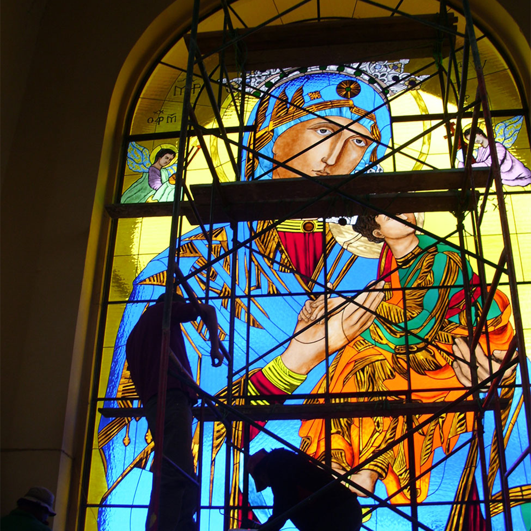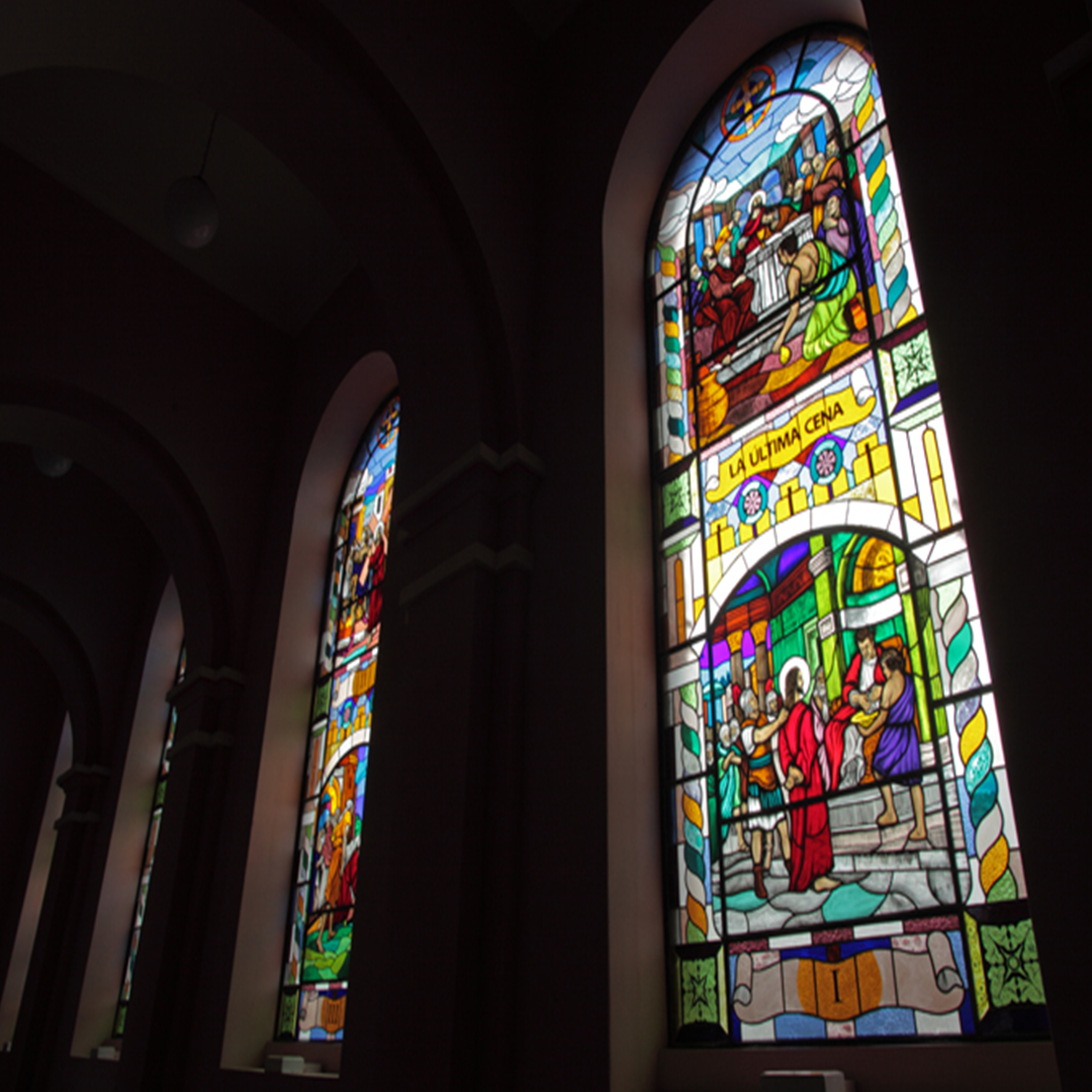 Una amplia experiencia en la elaboración de vitrales con escenas religiosas que incluyen imágenes. Este tipo de vitral se basa en la antigua técnica europea de la grisaglia al fuego, para la definición de rostros, manos y demás detalles.