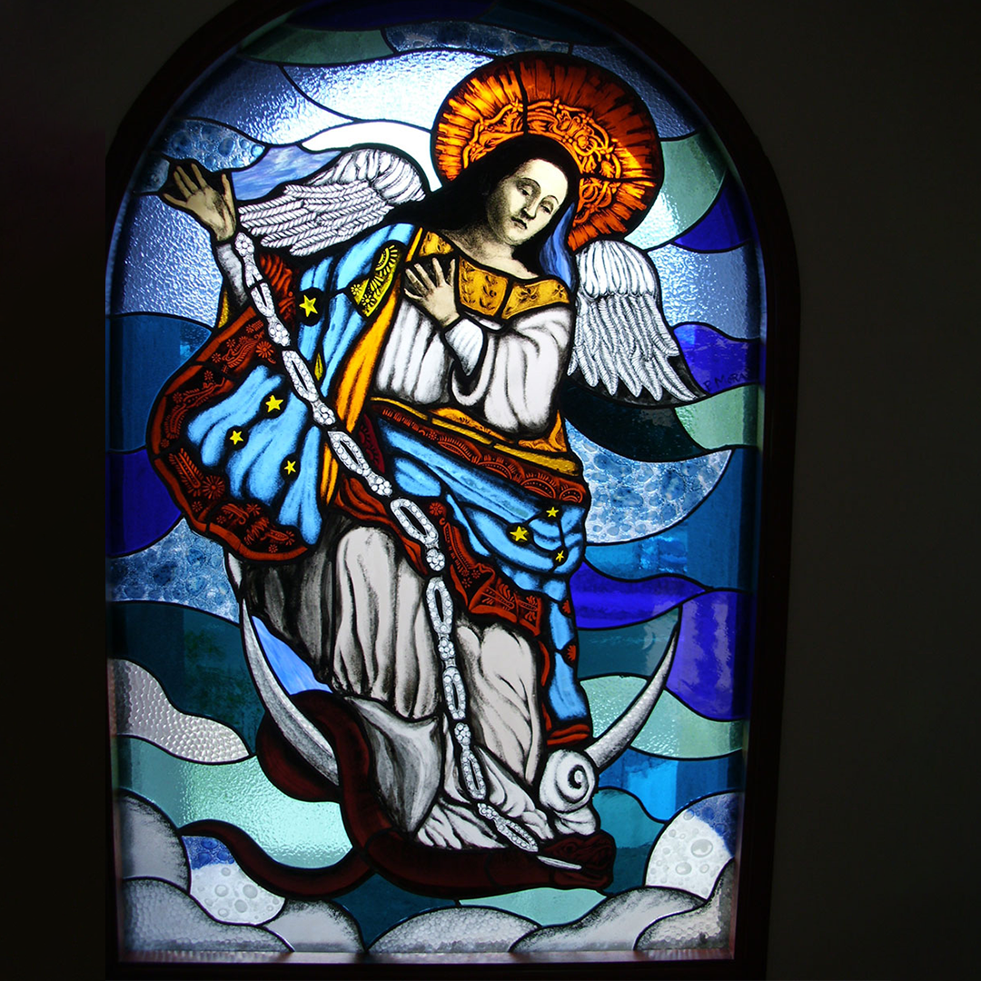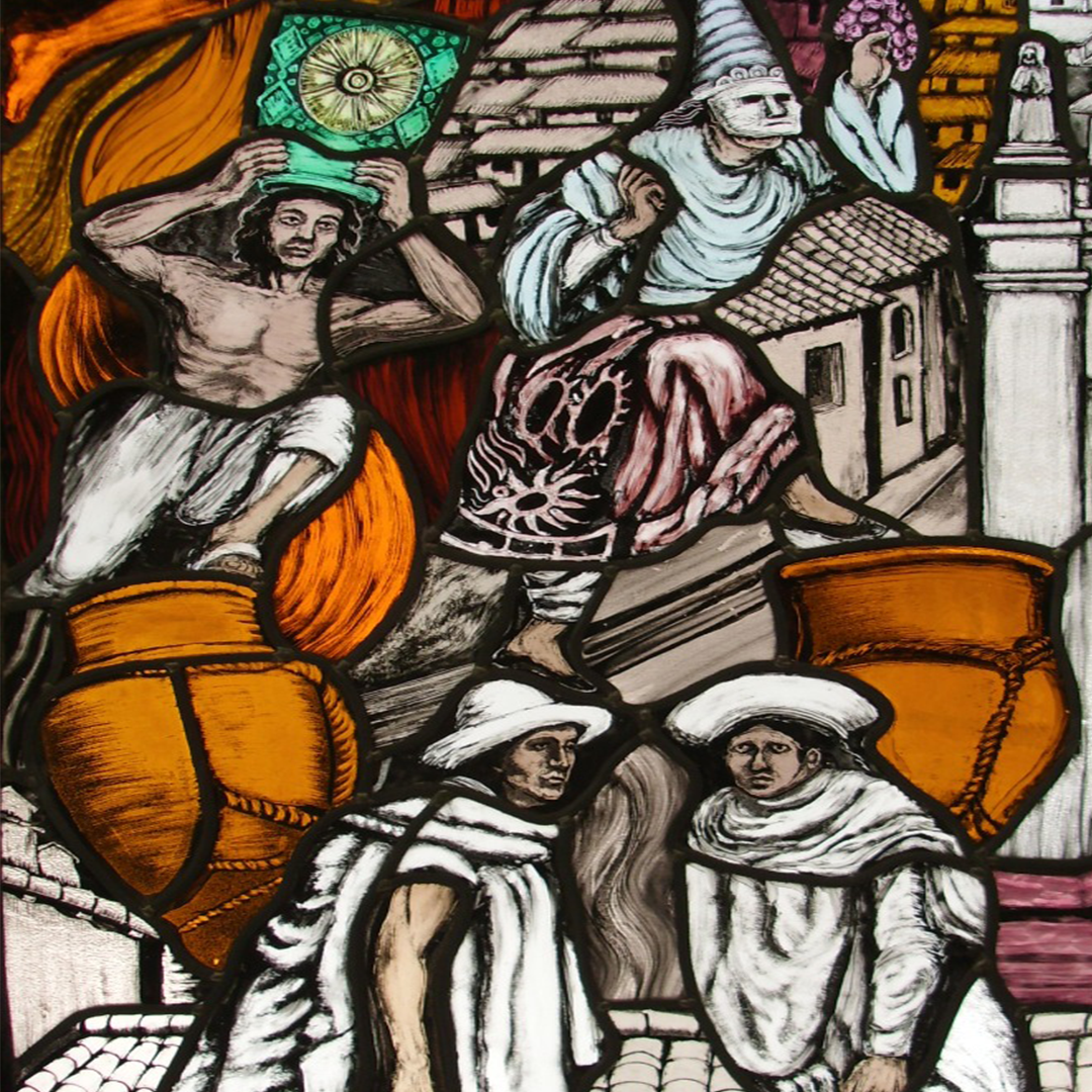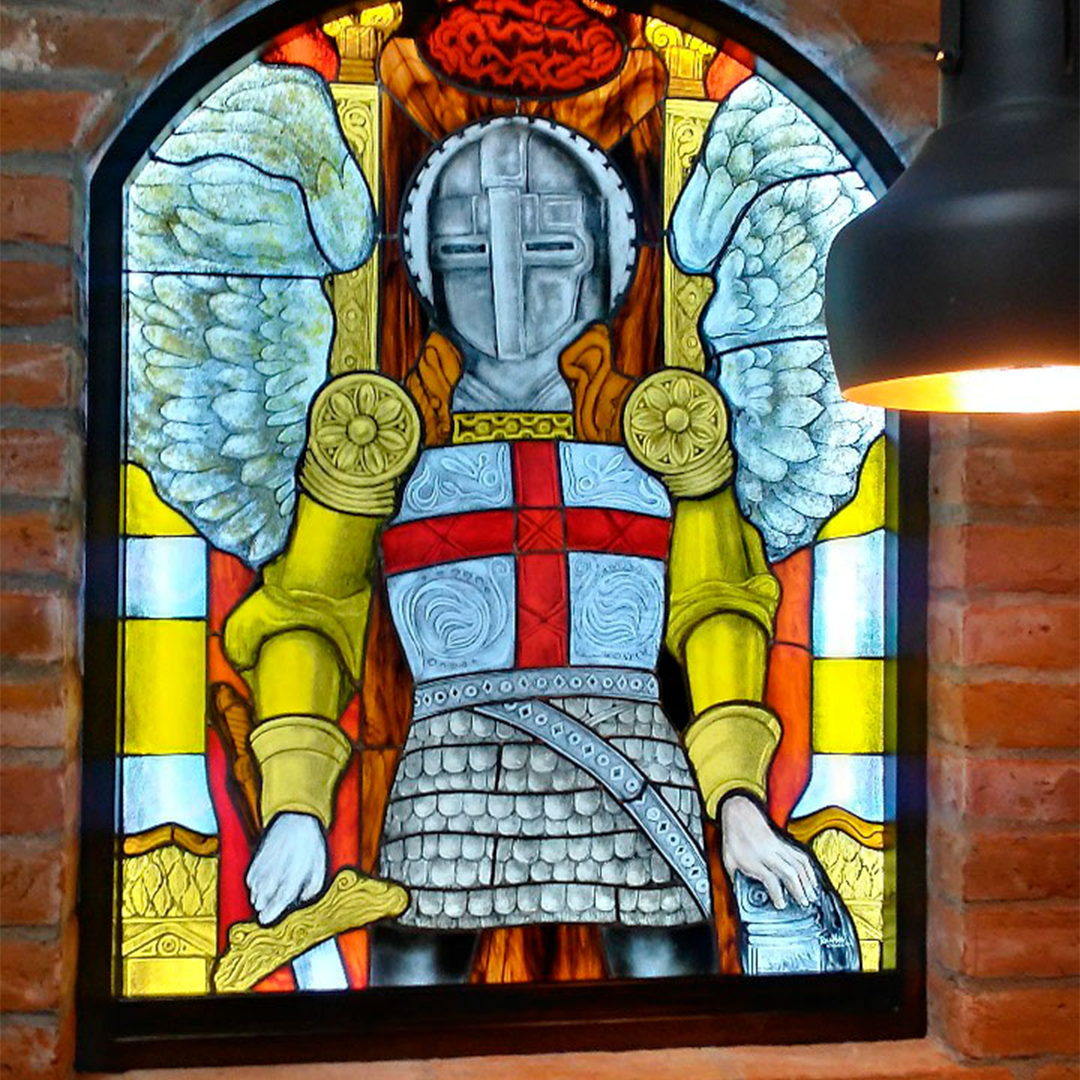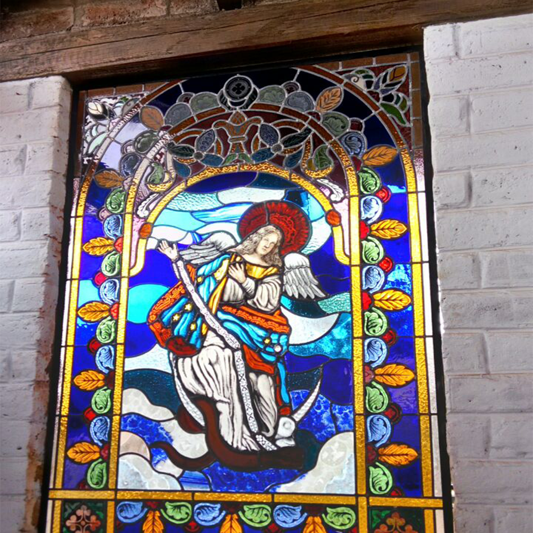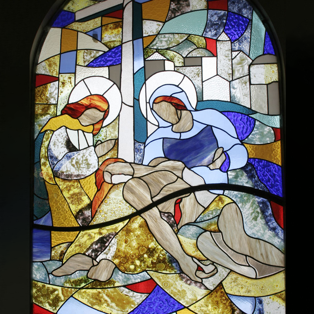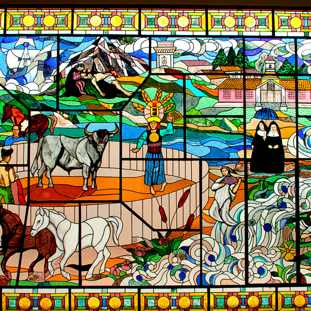 Una amplia experiencia en la elaboración de vitrales con escenas religiosas que incluyen imágenes. Este tipo de vitral se basa en la antigua técnica europea de la grisaglia al fuego, para la definición de rostros, manos y demás detalles.