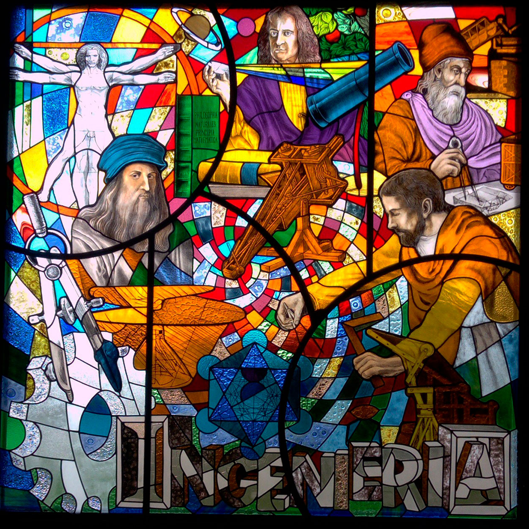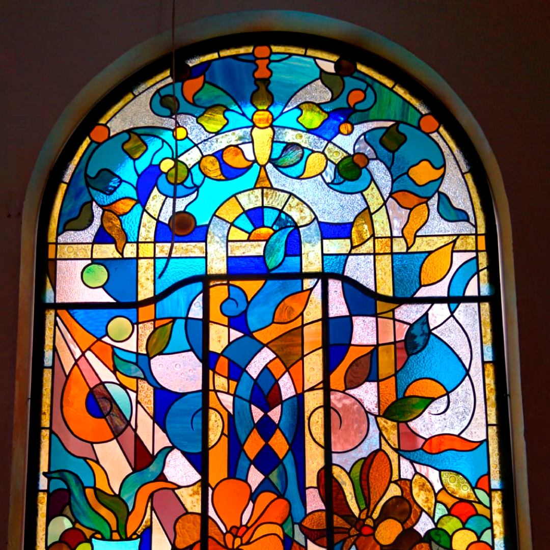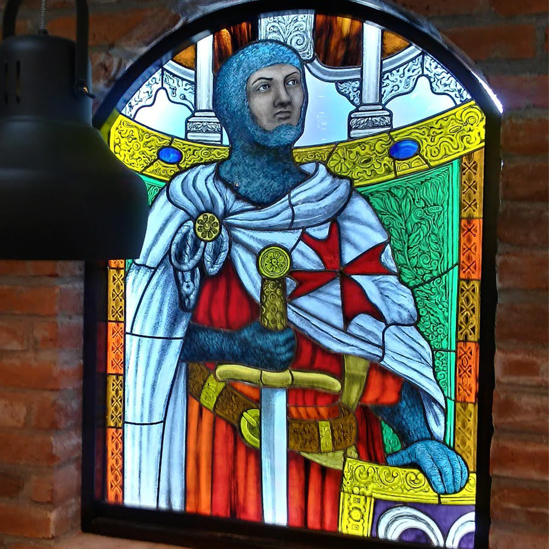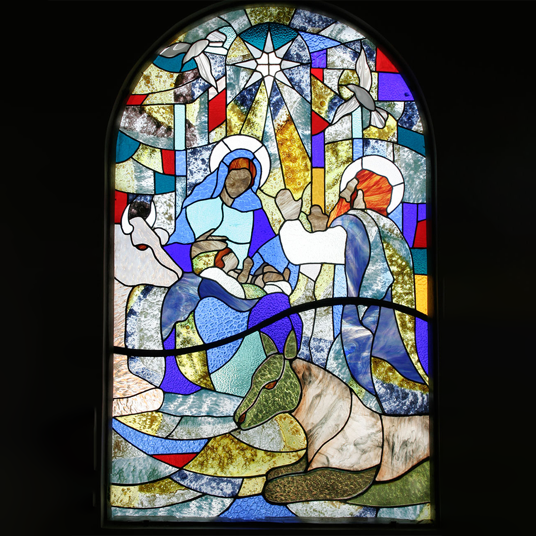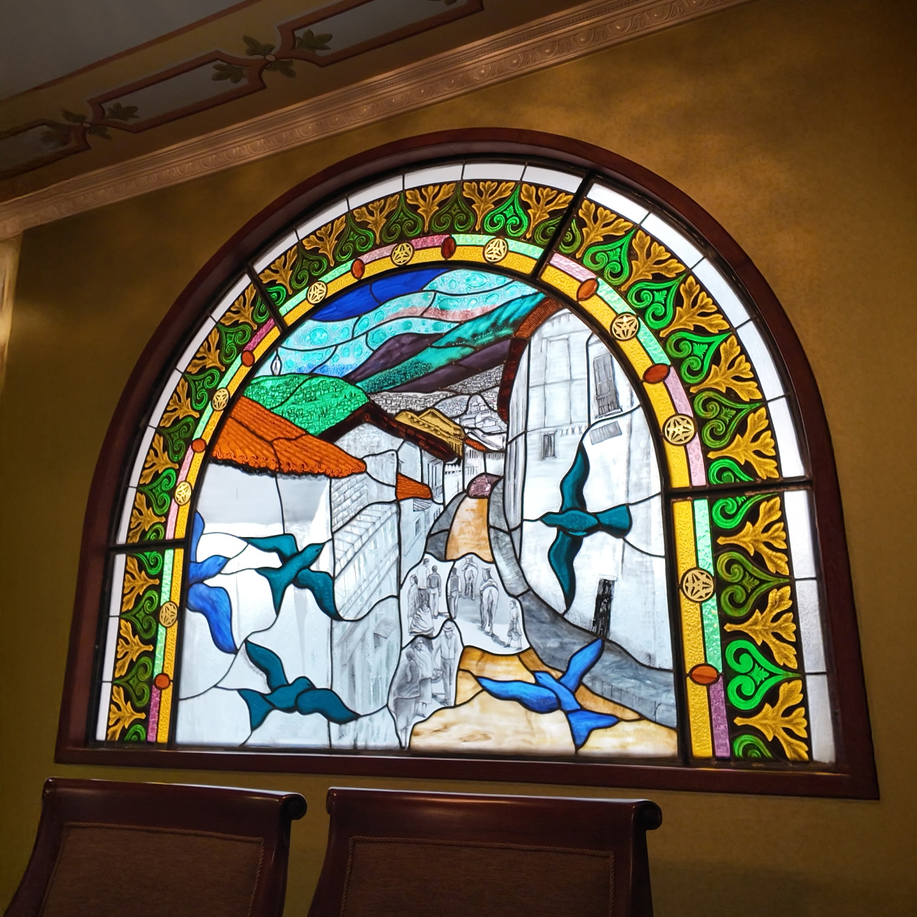 Una amplia experiencia en la elaboración de vitrales con escenas religiosas que incluyen imágenes. Este tipo de vitral se basa en la antigua técnica europea de la grisaglia al fuego, para la definición de rostros, manos y demás detalles.