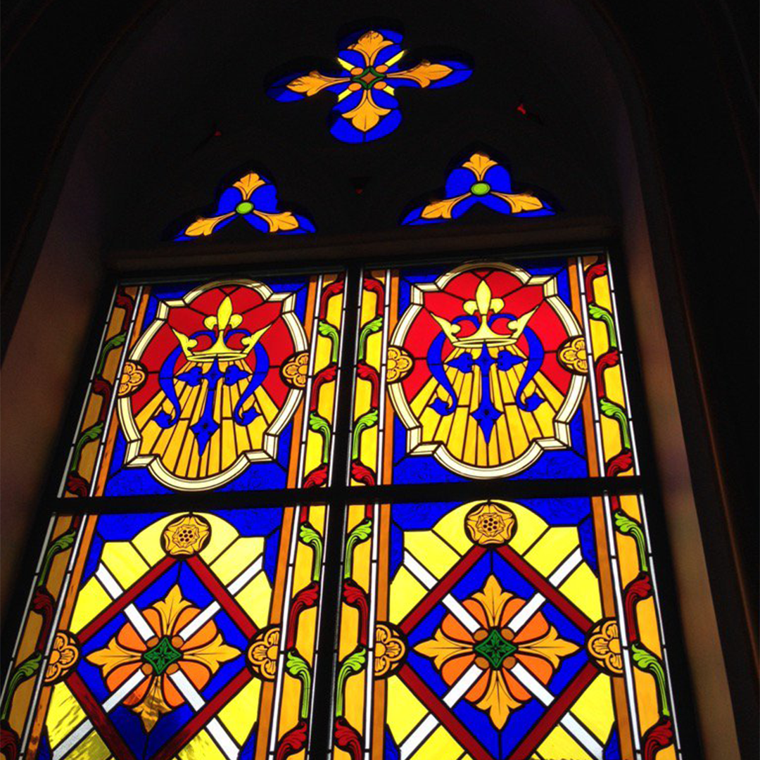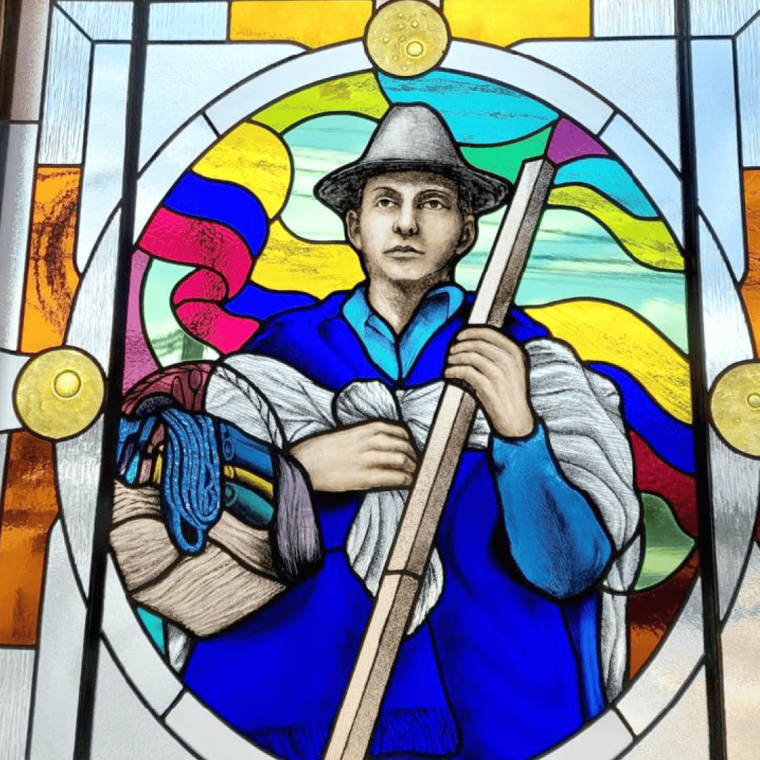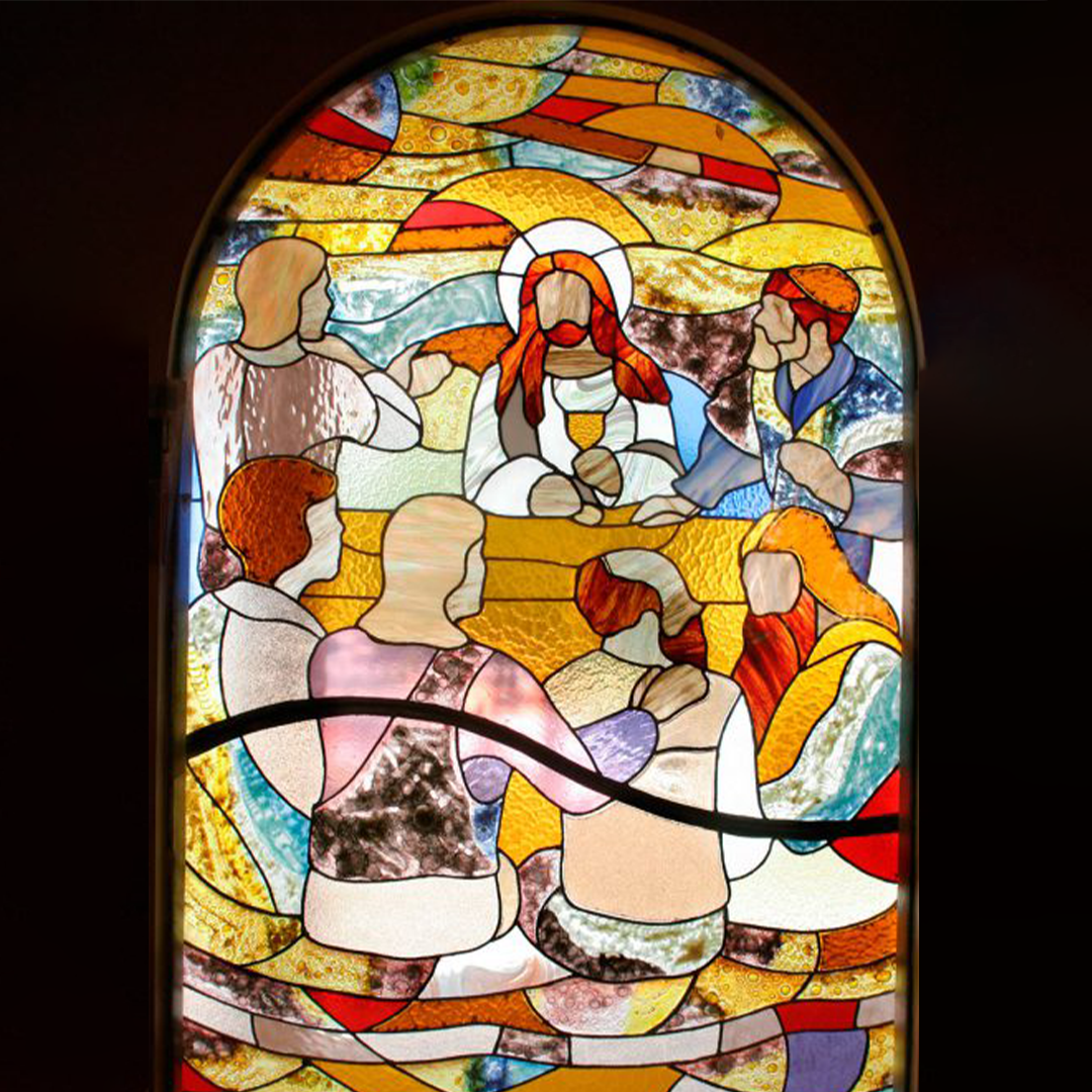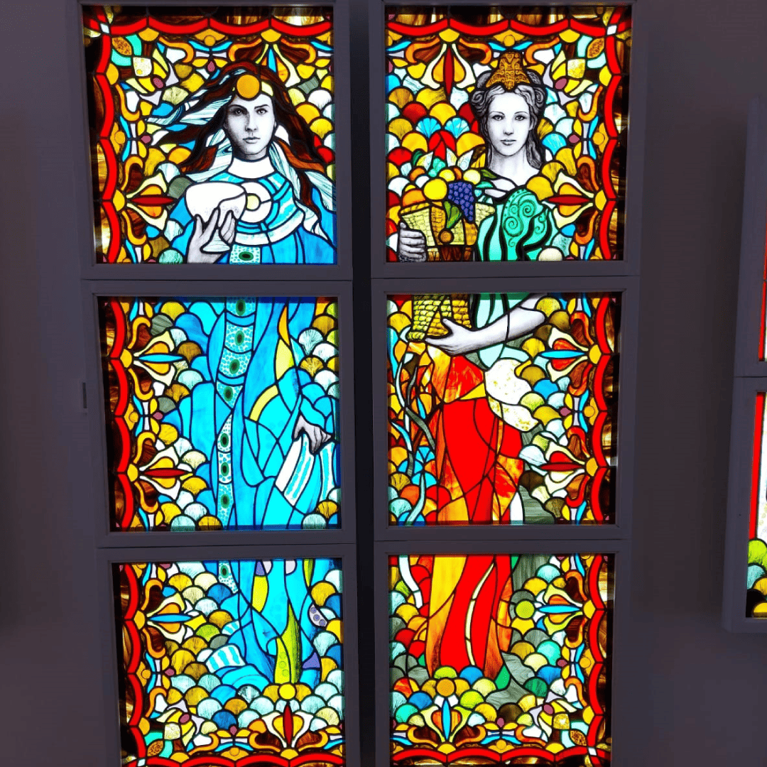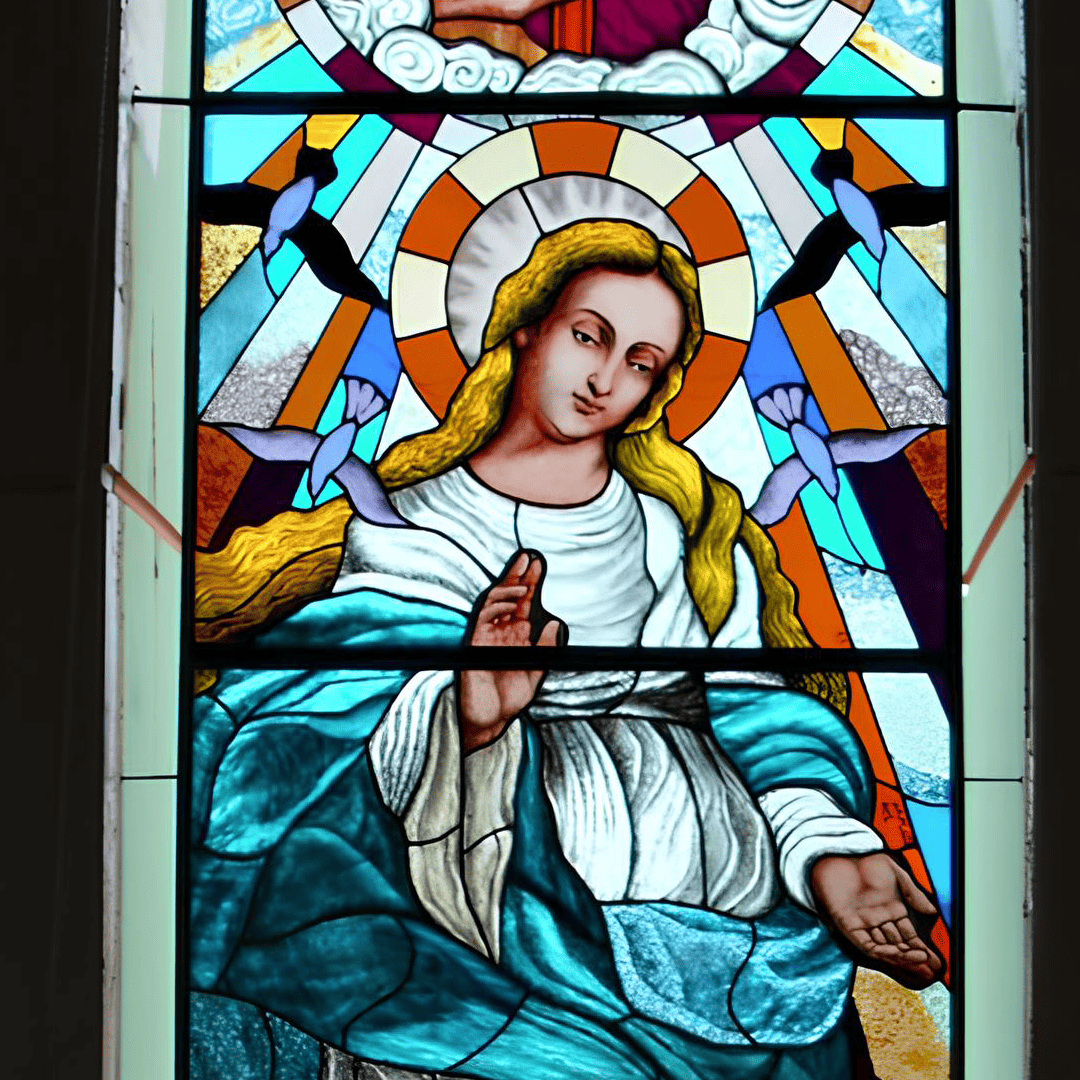 Una amplia experiencia en la elaboración de vitrales con escenas religiosas que incluyen imágenes. Este tipo de vitral se basa en la antigua técnica europea de la grisaglia al fuego, para la definición de rostros, manos y demás detalles.