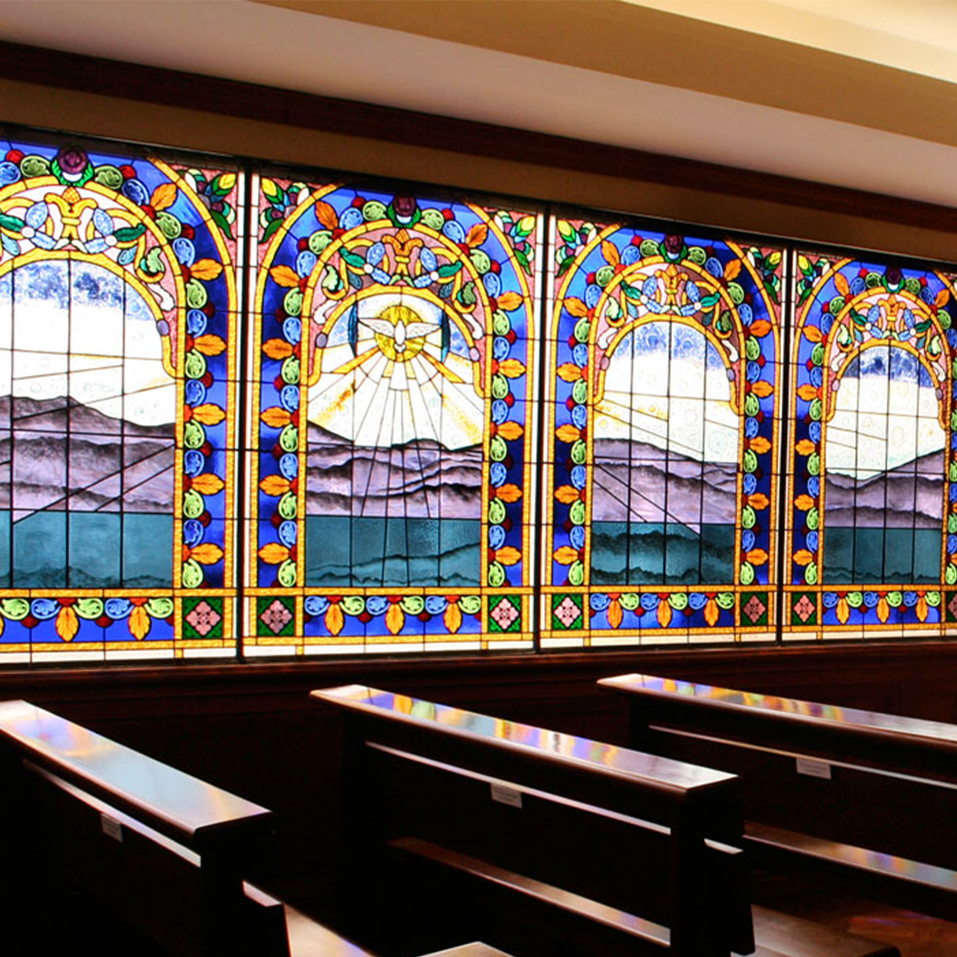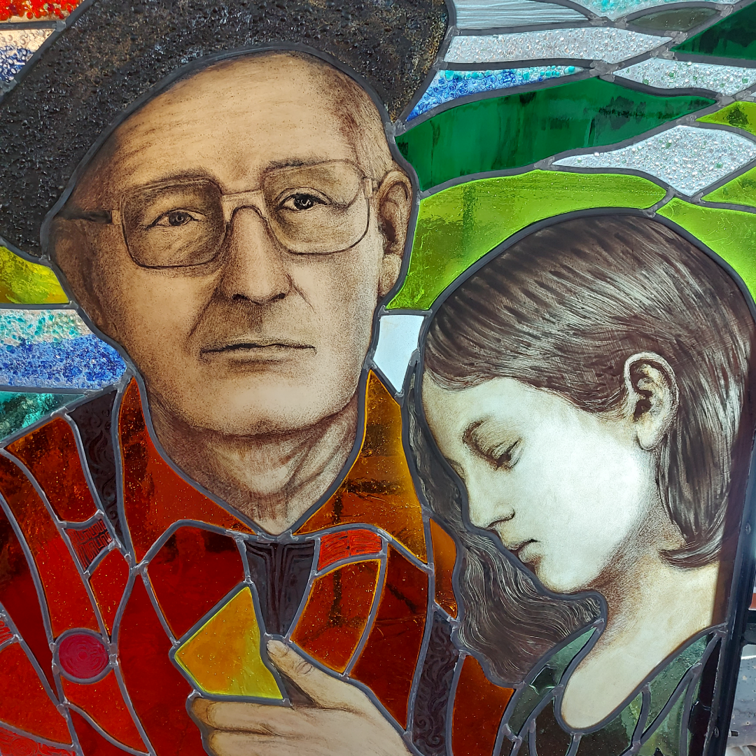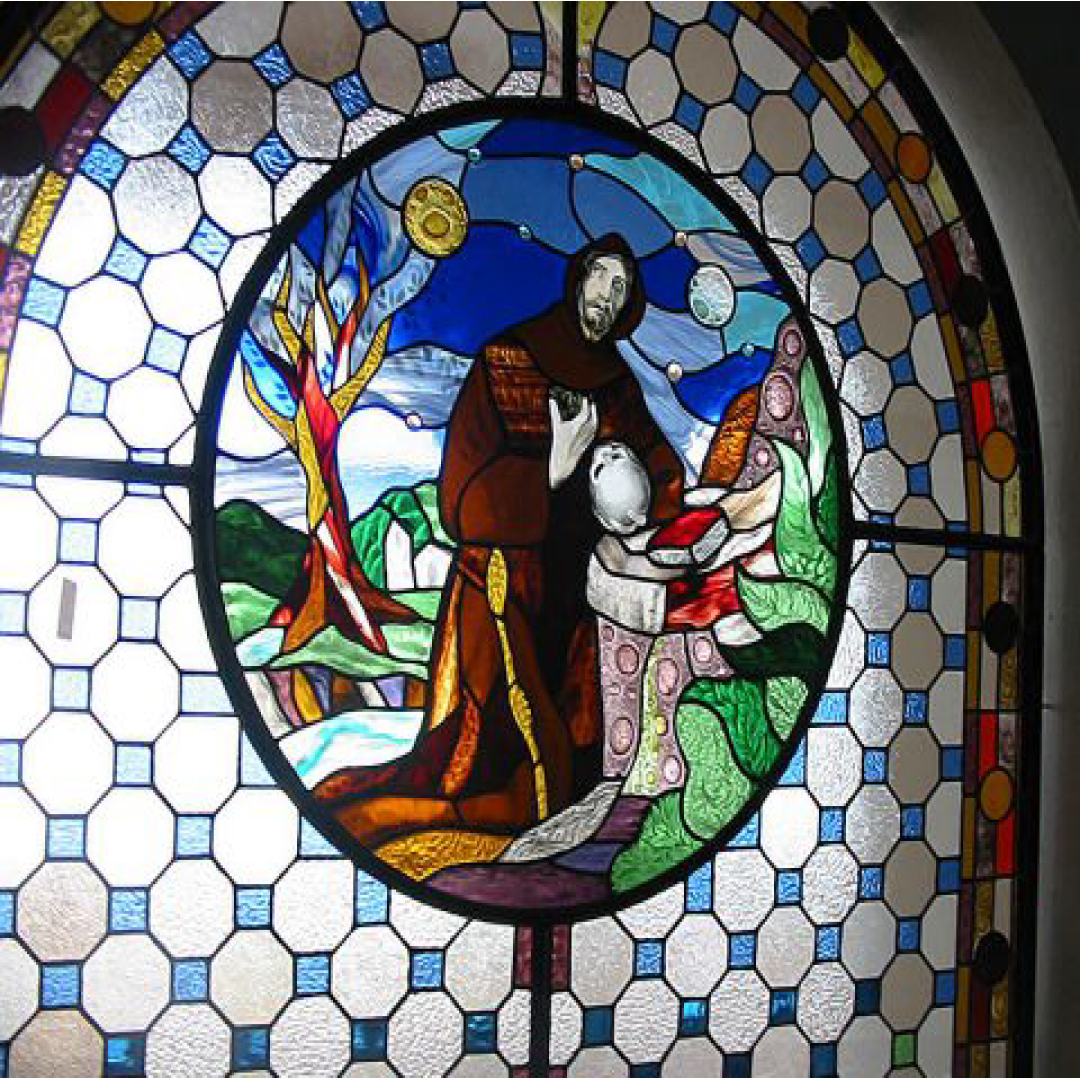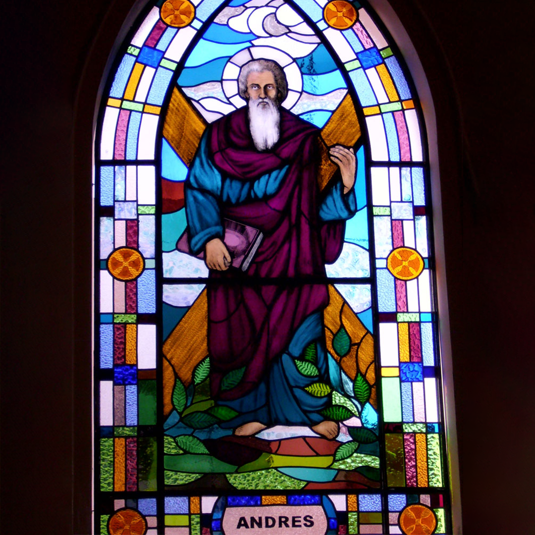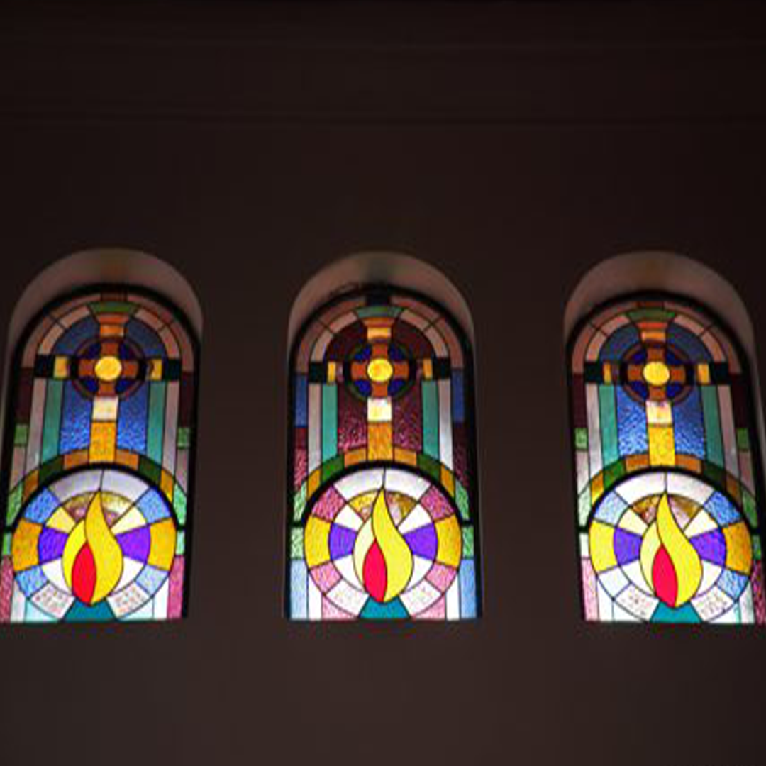 Una amplia experiencia en la elaboración de vitrales con escenas religiosas que incluyen imágenes. Este tipo de vitral se basa en la antigua técnica europea de la grisaglia al fuego, para la definición de rostros, manos y demás detalles.