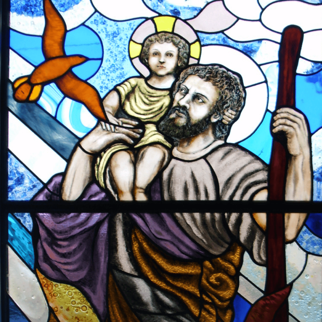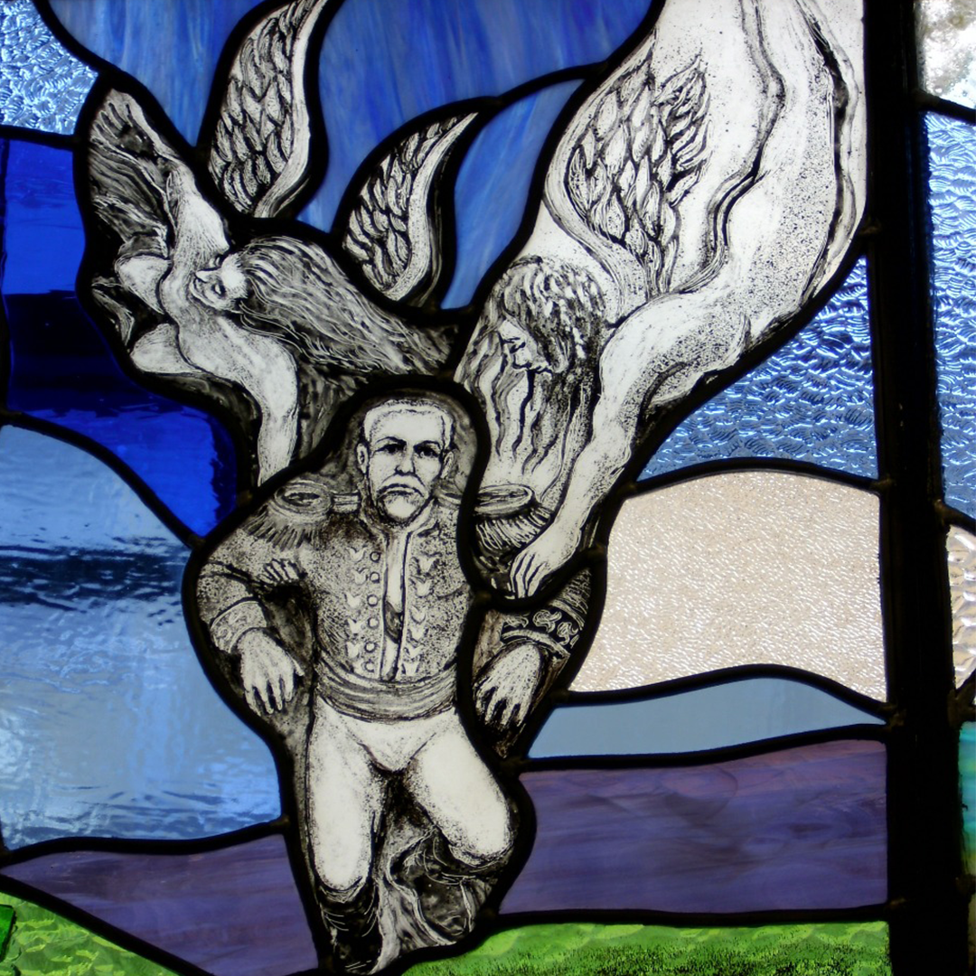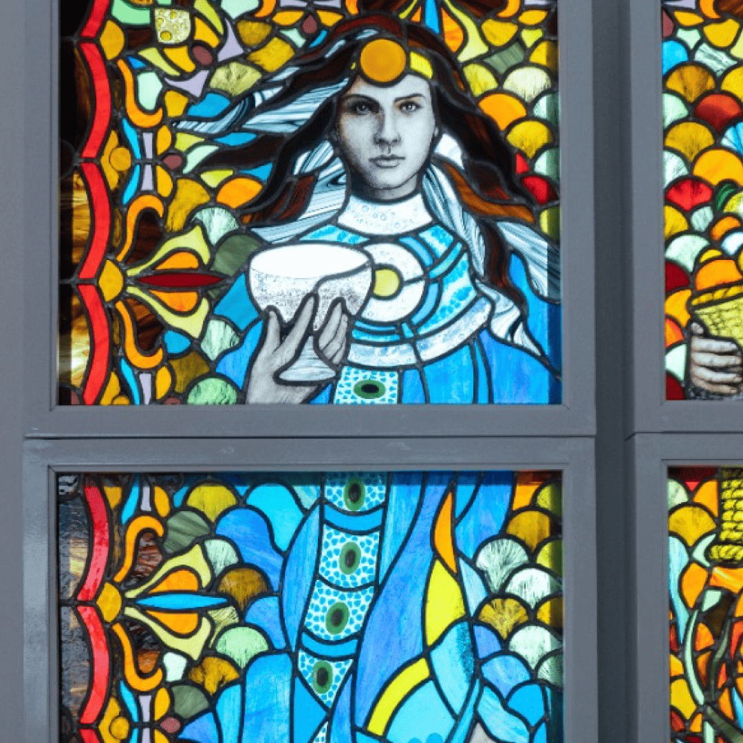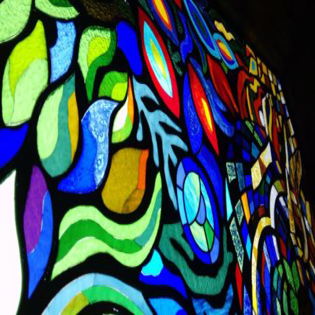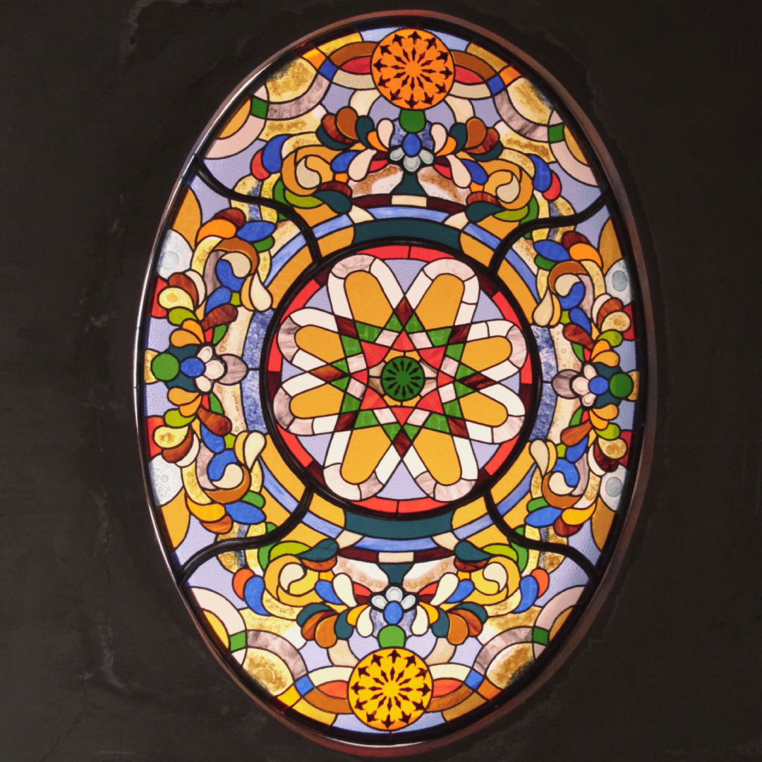 Una amplia experiencia en la elaboración de vitrales con escenas religiosas que incluyen imágenes. Este tipo de vitral se basa en la antigua técnica europea de la grisaglia al fuego, para la definición de rostros, manos y demás detalles.