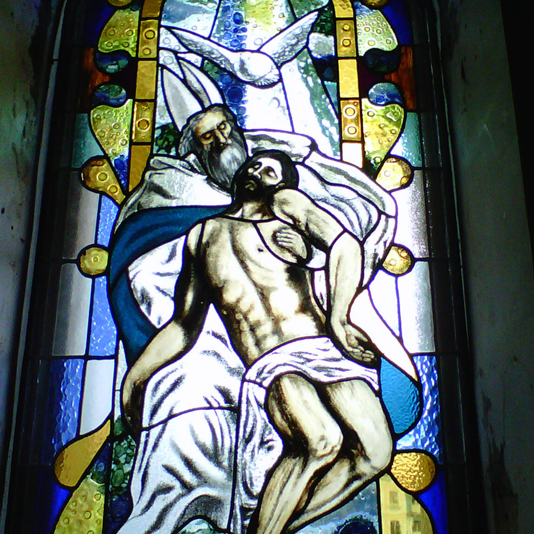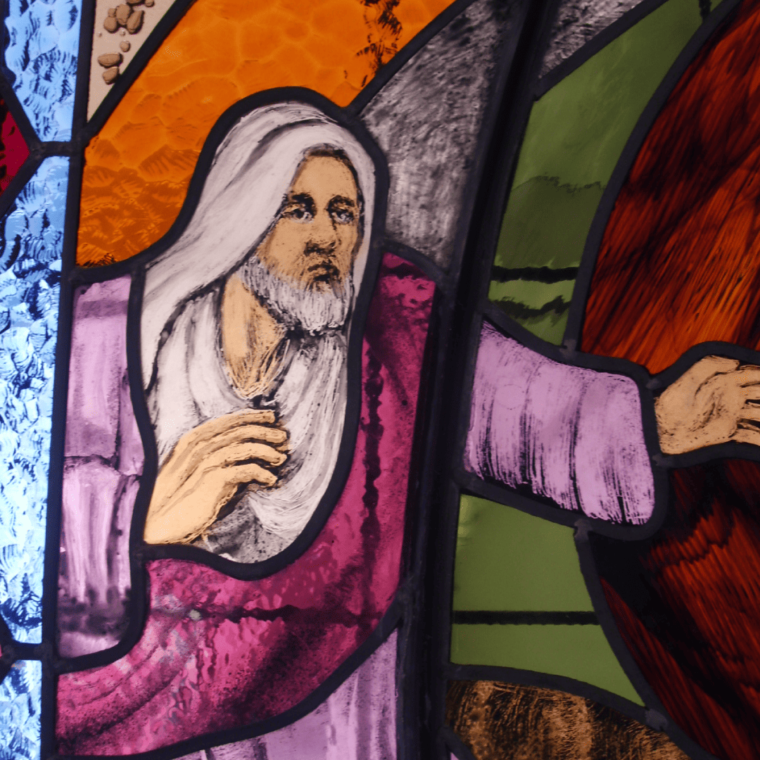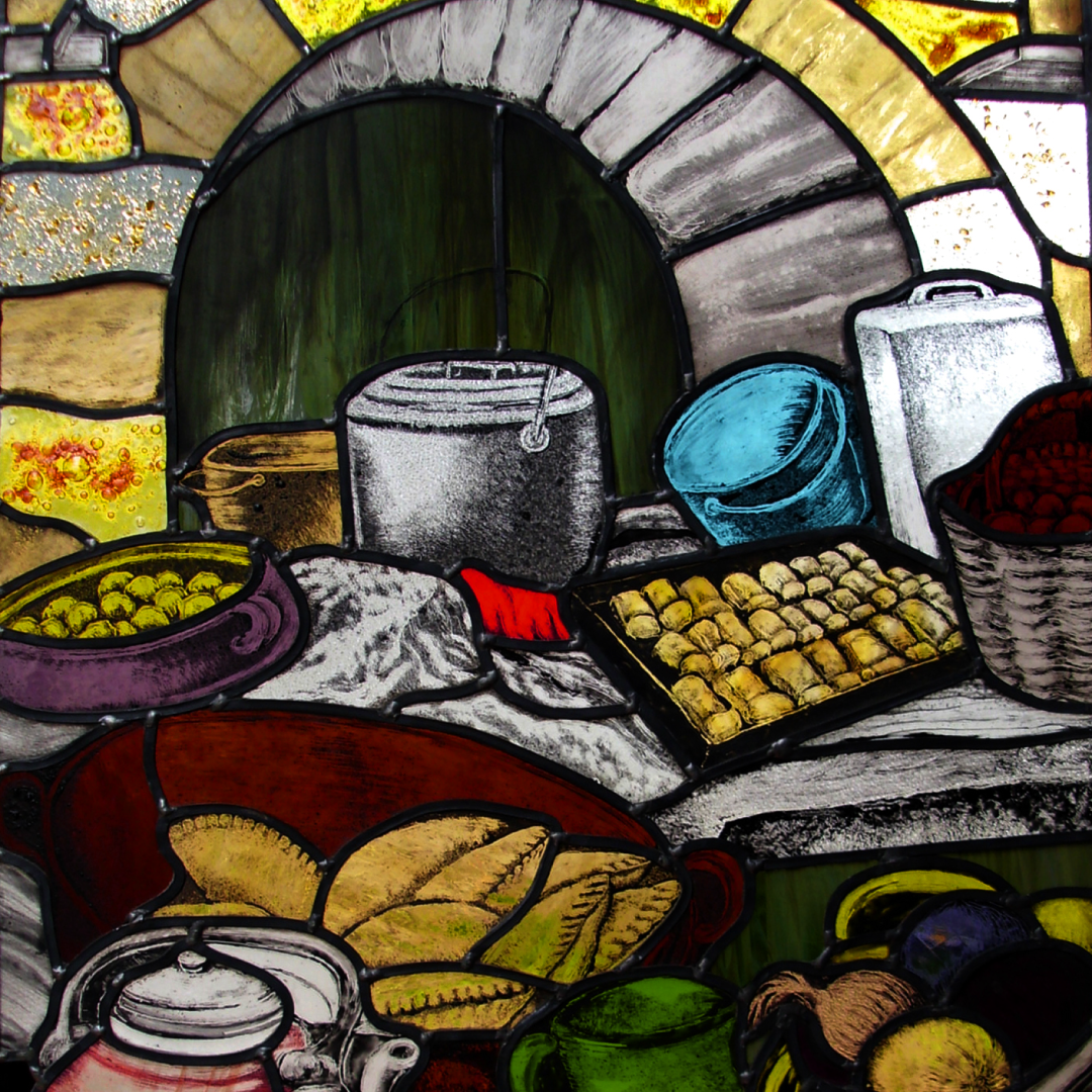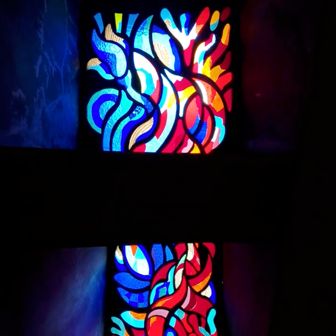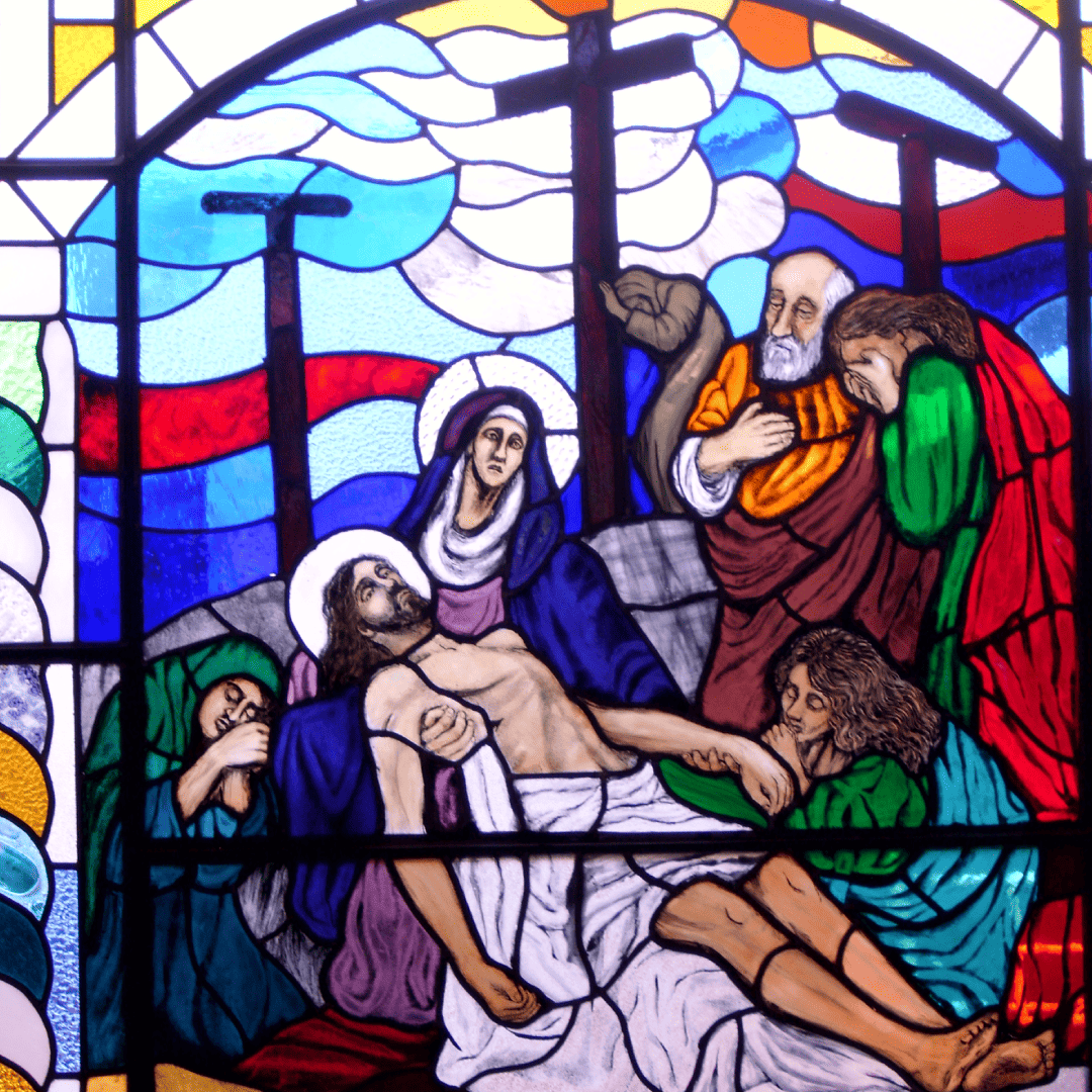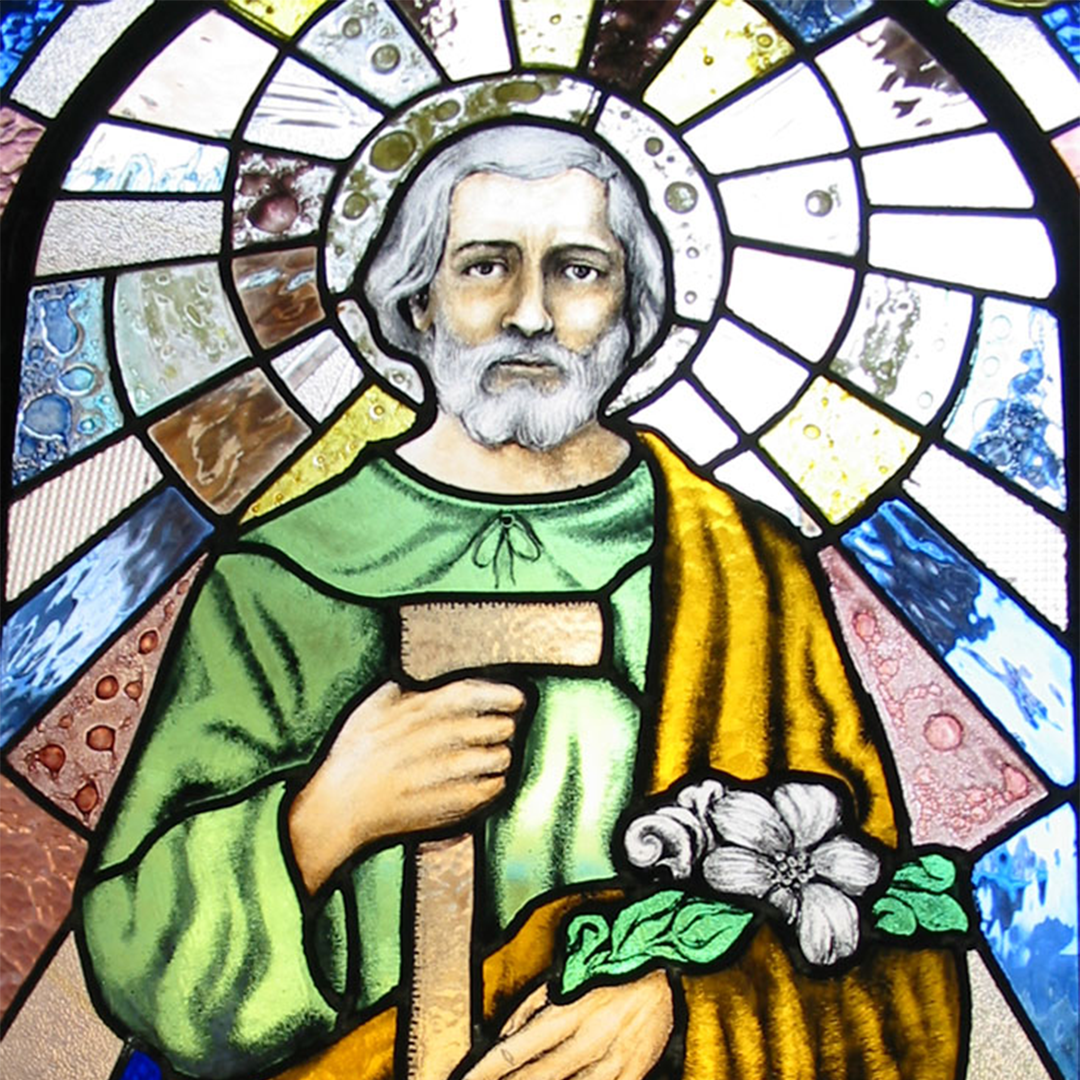 Una amplia experiencia en la elaboración de vitrales con escenas religiosas que incluyen imágenes. Este tipo de vitral se basa en la antigua técnica europea de la grisaglia al fuego, para la definición de rostros, manos y demás detalles.
