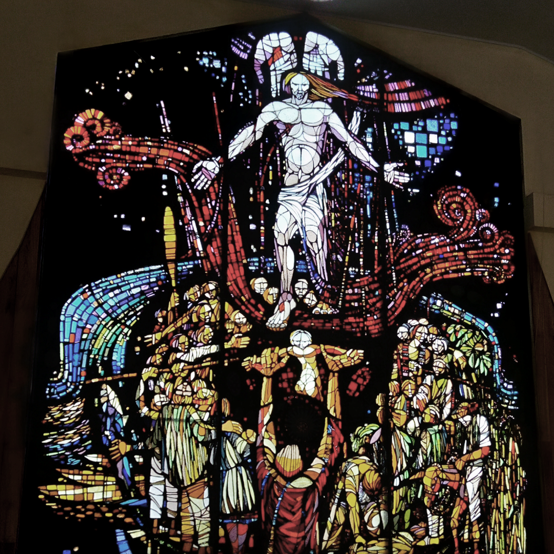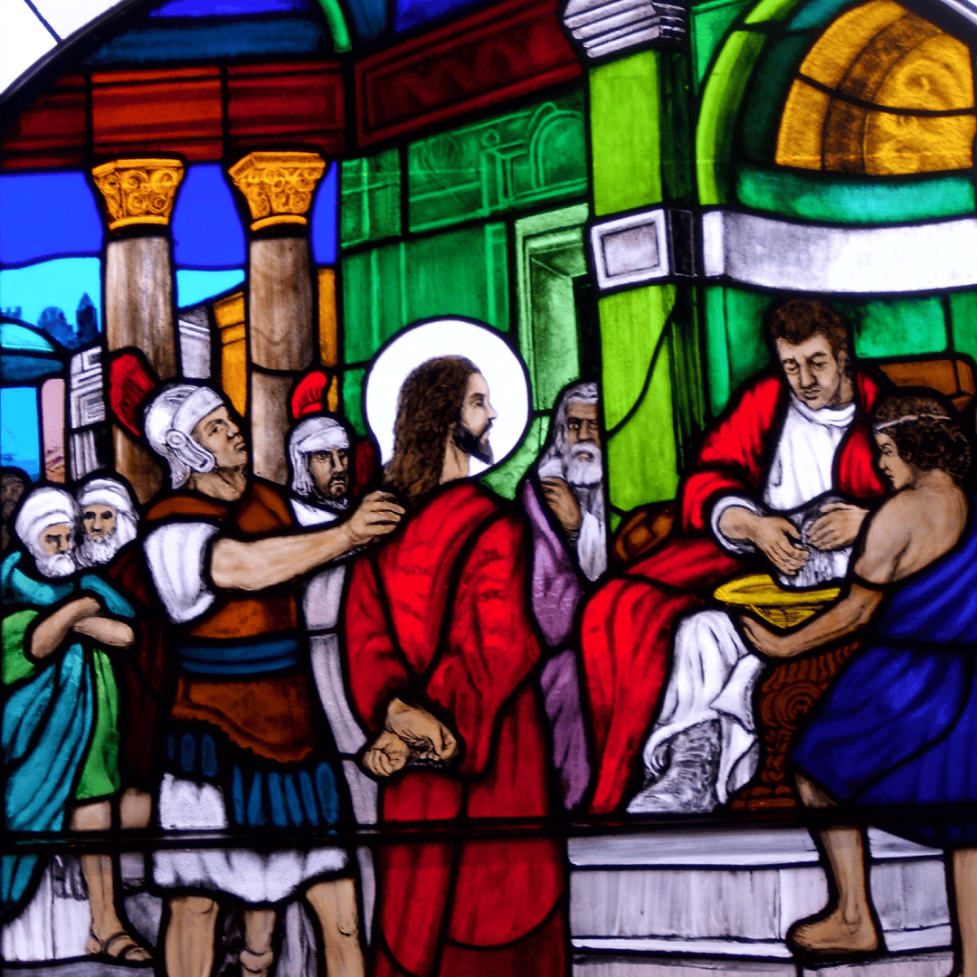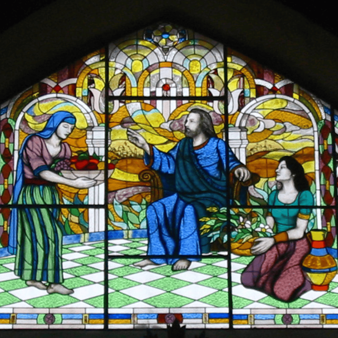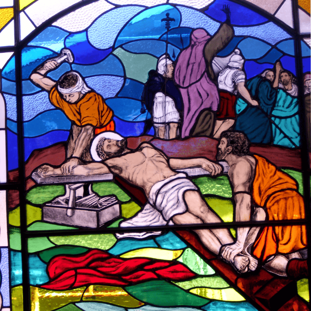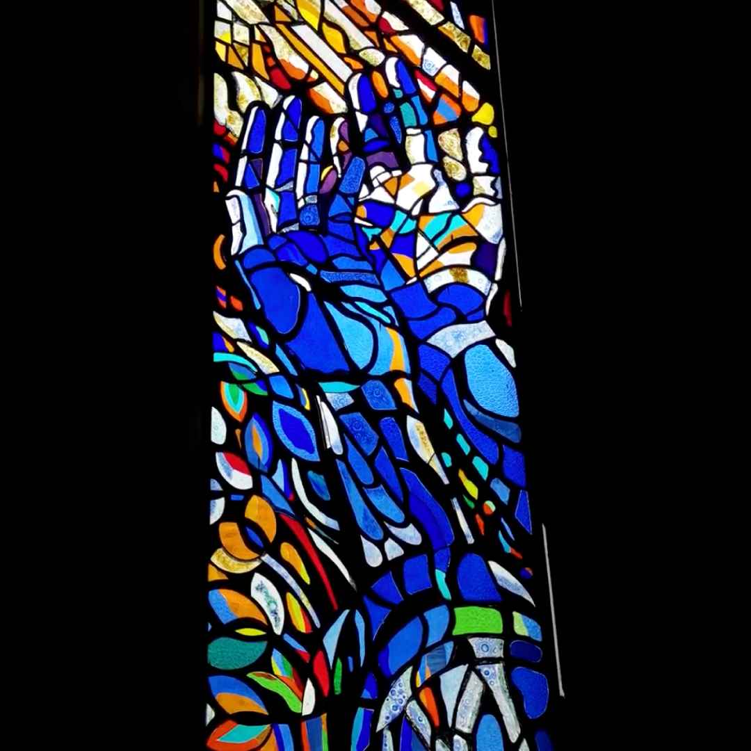 Una amplia experiencia en la elaboración de vitrales con escenas religiosas que incluyen imágenes. Este tipo de vitral se basa en la antigua técnica europea de la grisaglia al fuego, para la definición de rostros, manos y demás detalles.